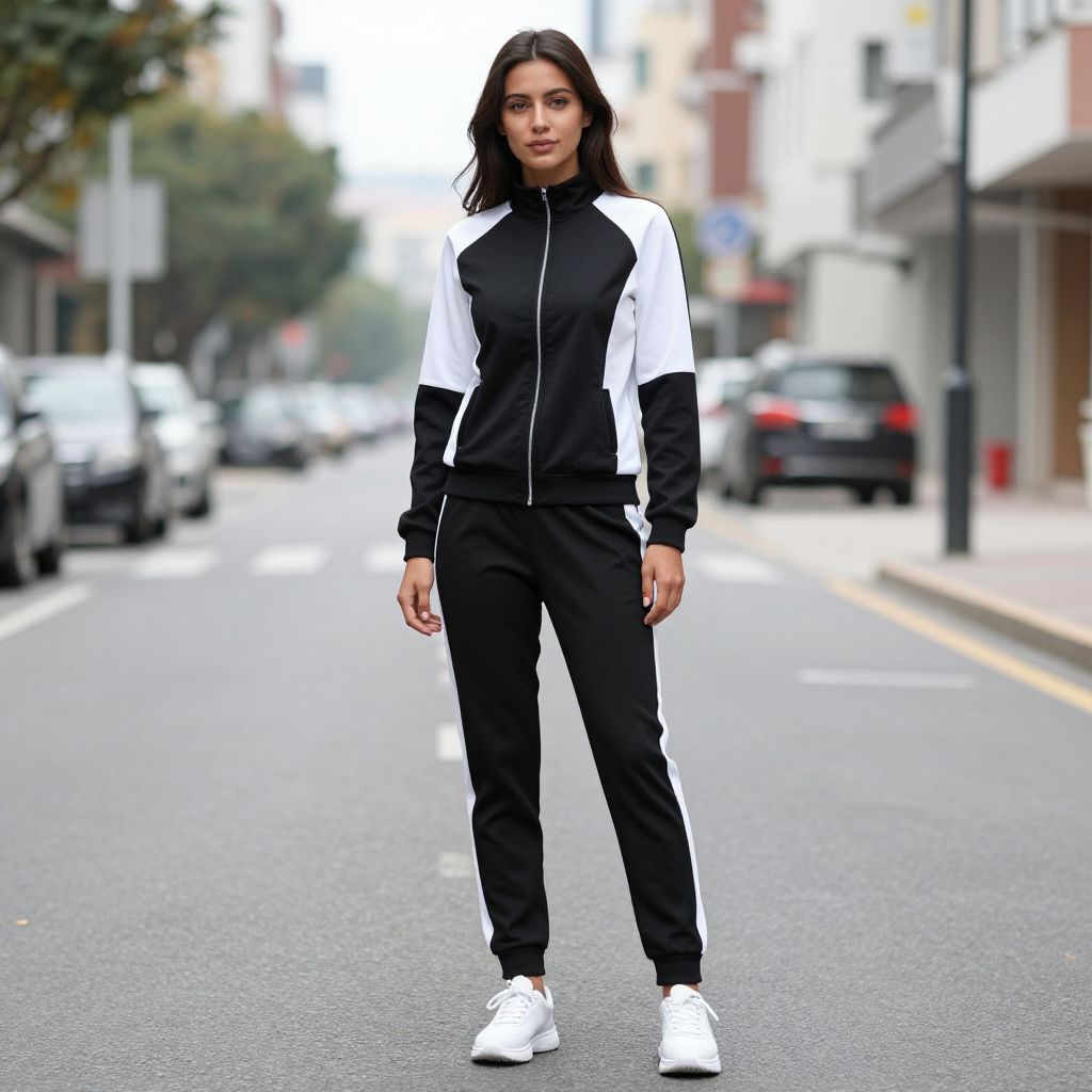 Tracksuit Outfit Woman Costume, woman in black and white jacket standing on street
