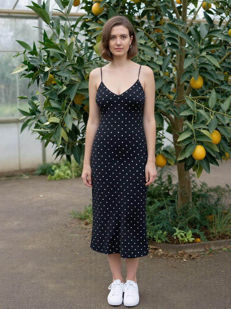A woman, in an Ilford film stock style, wearing a black midi slip dress with white polka dots and white sneakers, standing in a greenhouse with citrus trees. Sexy. Pretty face and beаutiful eyes. Big breasts