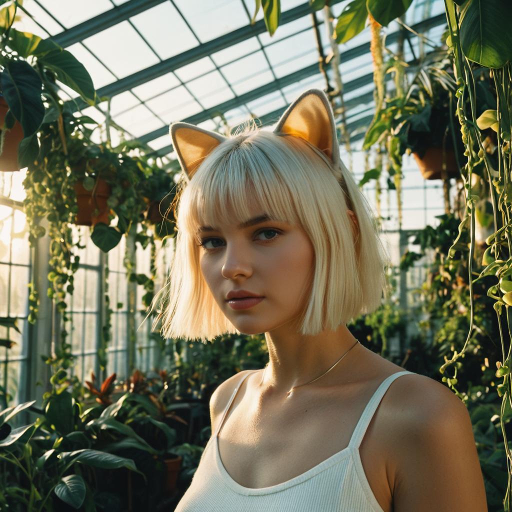 A commercial photo of a bright sunlit greenhouse filled with tropical plants and hanging vines, featuring a Scandinavian female model with platinum blonde bob kitty ears style. Golden hour lighting, hyperrealistic renderings, 8K resolution, cinematic composition