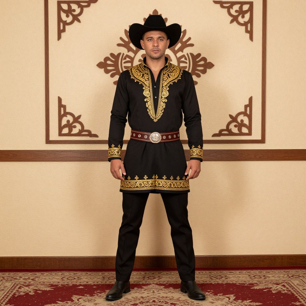 Photograph of a young man with medium brown skin and short black hair, standing in a room with beige walls and ornate brown trim. He wears a black cowboy hat, a black long-sleeve shirt with gold embroidered trim along the collar, cuffs, and hem, and black pants with matching gold embroidery. A brown belt with a silver buckle cinches his waist. He stands confidently with his hands by his sides on a red and cream patterned carpet. The background includes a symmetrical decorative wall design. The overall style combines Western and traditional elements.