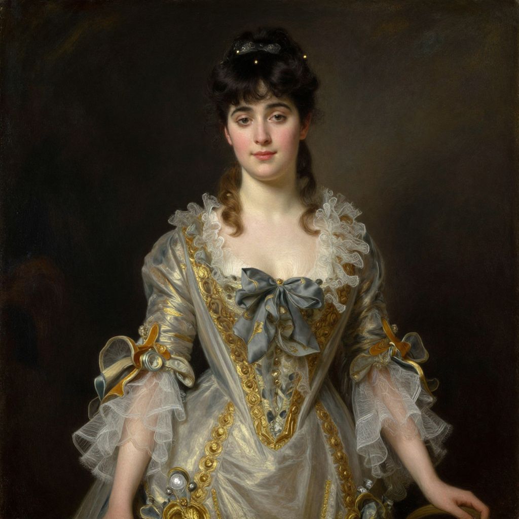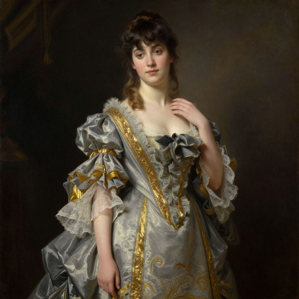 A finely detailed oil painting reminiscent of Frederick Leighton's style, depicting a woman in a Victorian-era gown adorned with intricate ruffles and gold accents, exuding elegance against a dark, moody background.