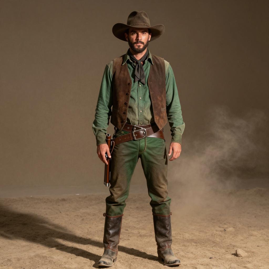 Victorian explorer costume, photorealistic, man standing on cobblestone street, old western style outfit, brown leather pants, brown boots, wide-brimmed hat, yellow bandana, black leather belt with holster, blurred background, people walking, buildings on both sides, daytime, sunlight, realistic ures, casual pose, slight shadow, 19th-century western setting, outdoor, historical costume, realistic lighting