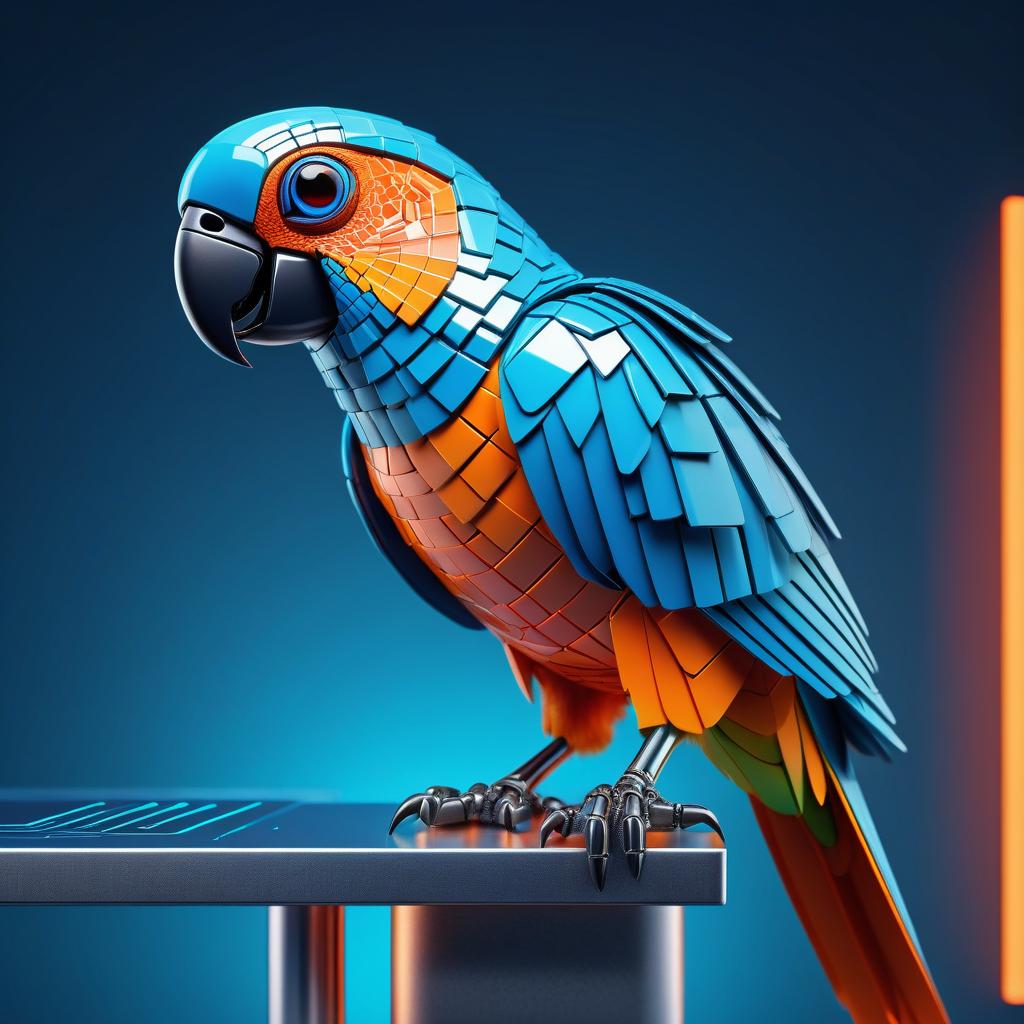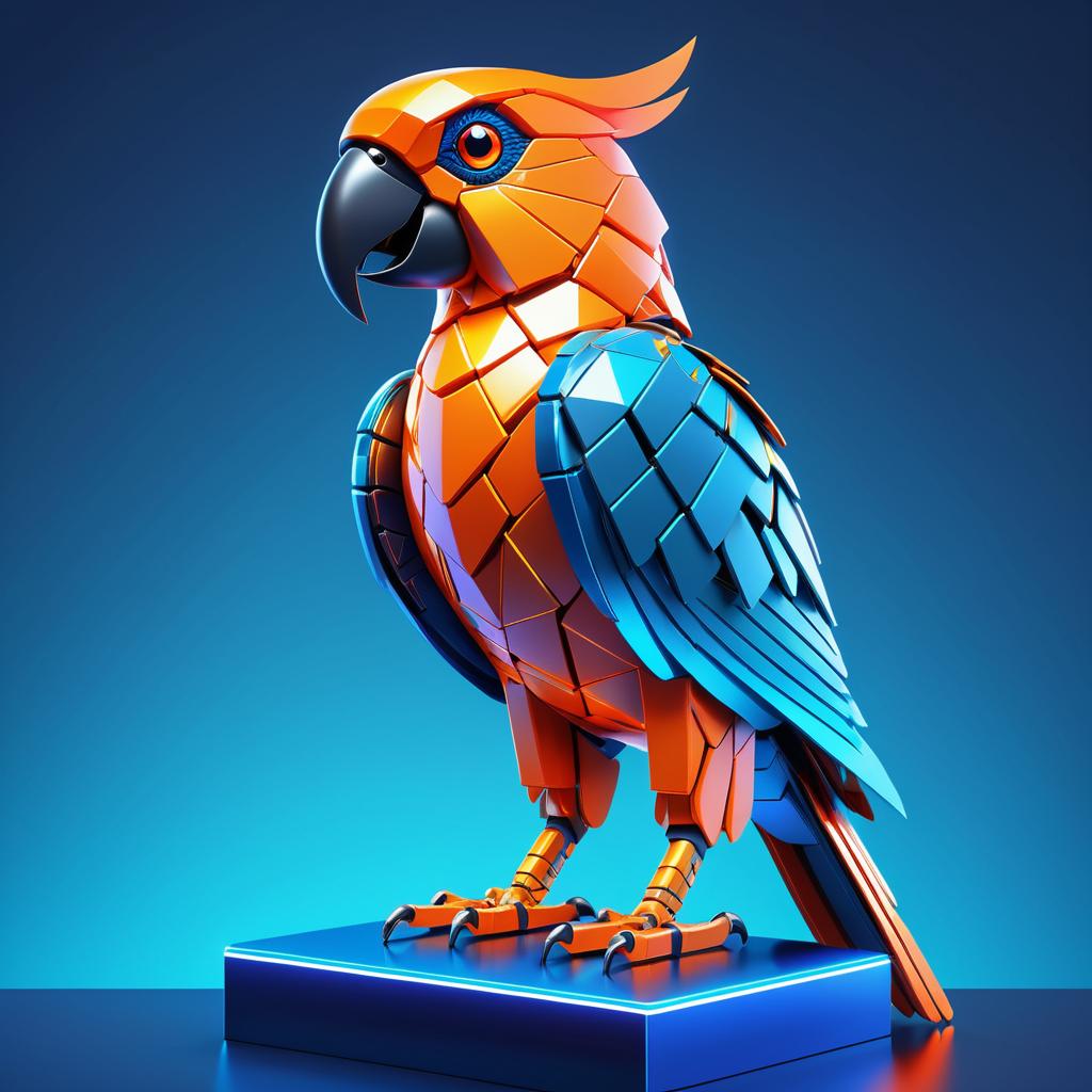 A detailed cybernetic parrot with geometric, blocky segmented feathers in sleek blue and bright orange colors. The parrot features a glowing neon eye emitting a WiFi symbol and sharp metallic claws, perched on a modern metallic bar in a clean studio environment with blue and orange neon accents.