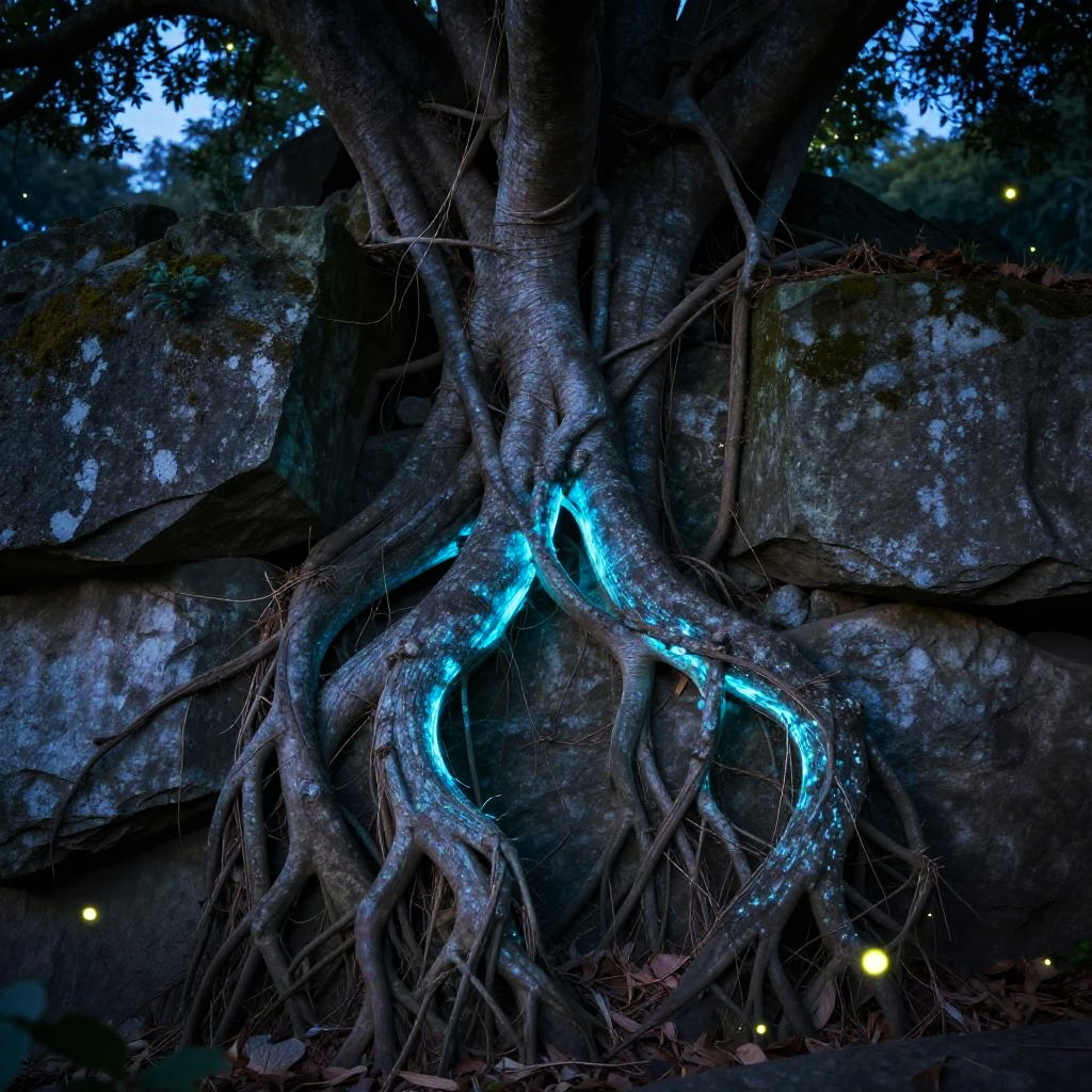 Glowing Tree Roots and Ancient Stones