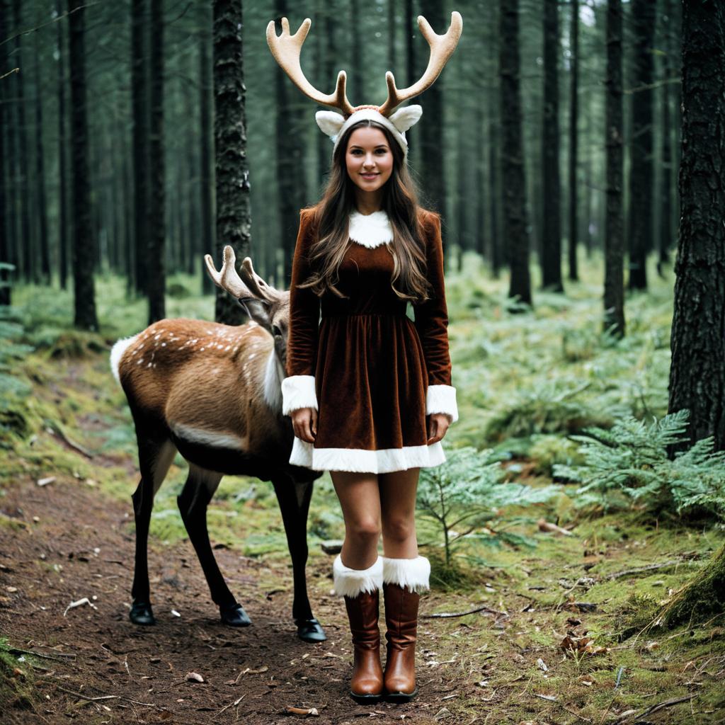 Boy moose costume fancy,male focus, solo, 1boy, antlers, nature, outdoors, forest, looking at viewer, tree, horns, blurry background, blurry