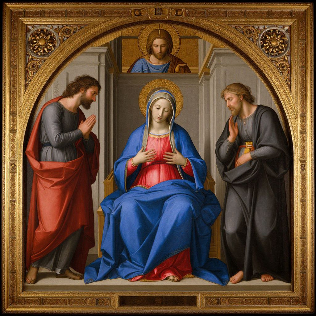 Fra Angelico's *The Dormition of the Virgin* (c. 1425) depicts a solemn scene where three figures—two men and a woman—stand before a seated Virgin Mary, who is adorned in a rich blue robe with a red garment beneath, her hands gesturing as if in prayer or blessing. Above them, a haloed figure, likely Christ, overlooks the scene, while the ornate golden frame and decorative motifs enhance the sacred atmosphere of this tempera painting on panel.