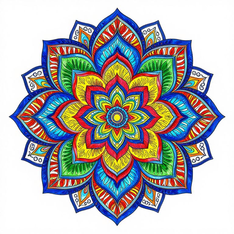 Intricately detailed digital mandala with a symmetrical floral design. Features bold colors including blue, green, red, and yellow in a mixed media style inspired by mandala art techniques. The design showcases layered petals and abstract patterns creating a visually rich and balanced composition.