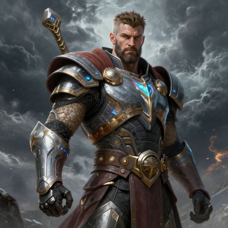 Digital artwork of a muscular, bearded warrior with dark hair, wearing detailed, glowing blue and gold armor, standing in a stormy sky.