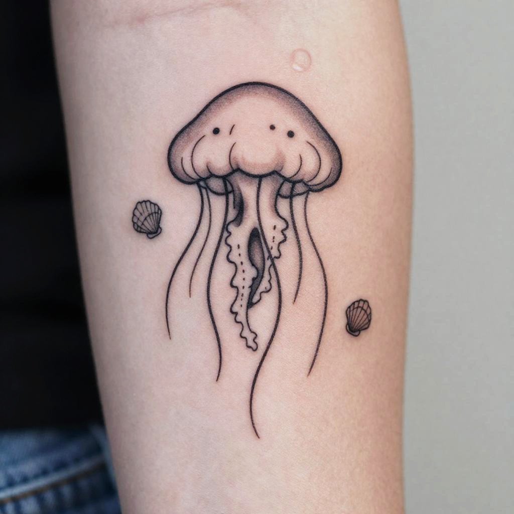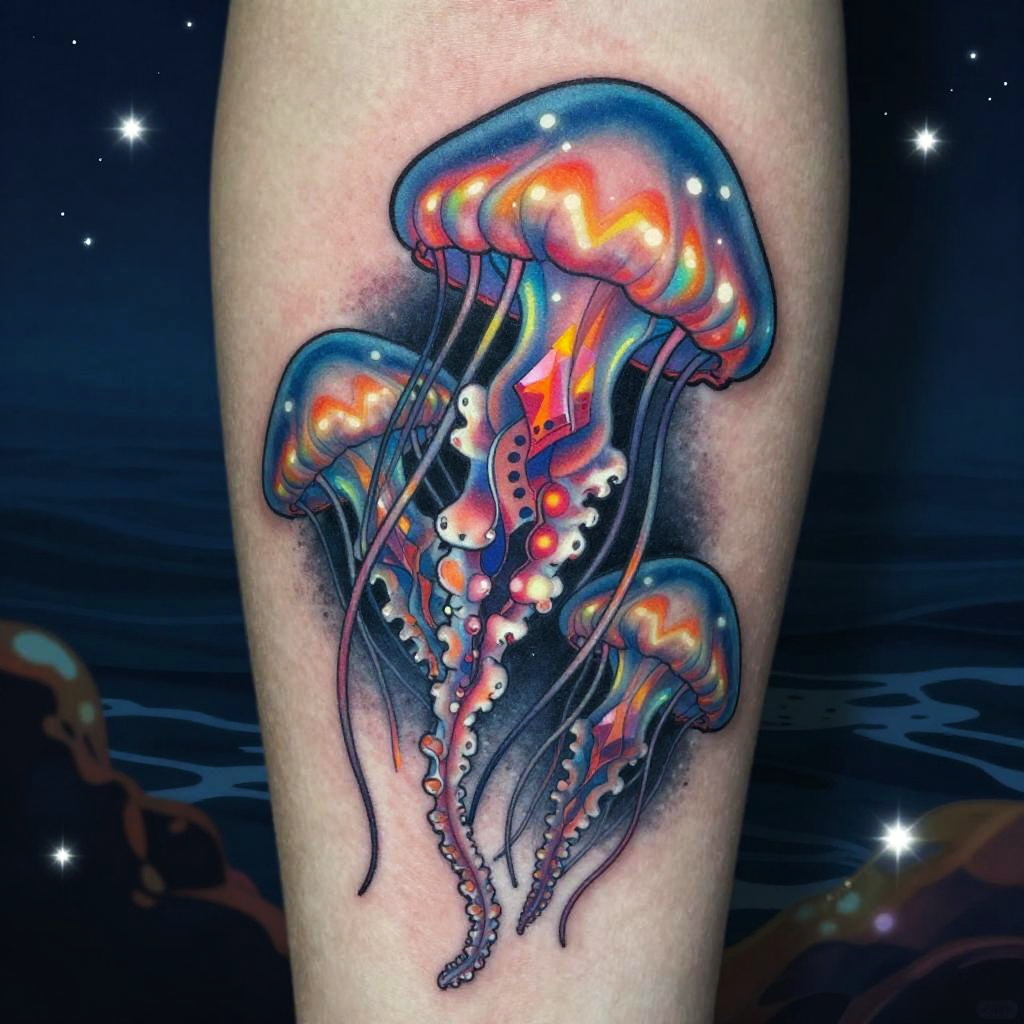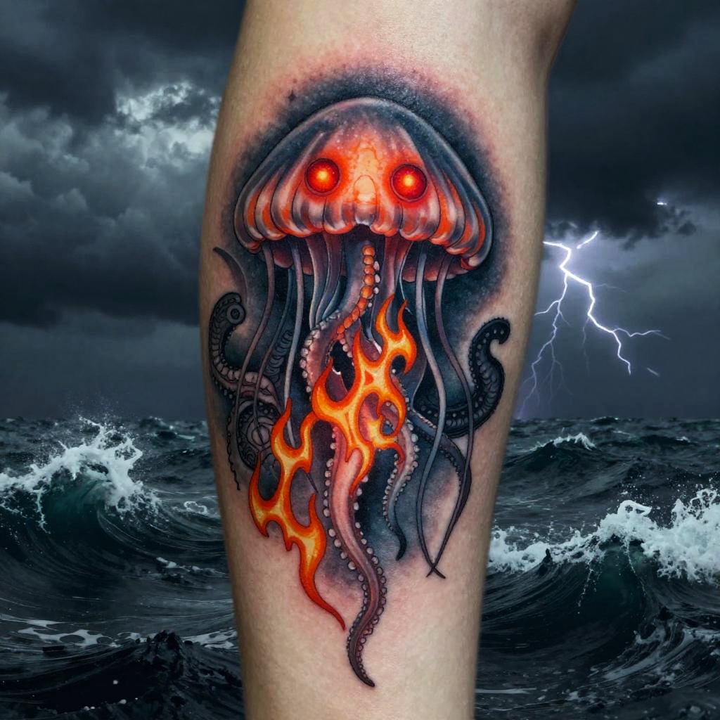 Dark fantasy jellyfish tattoo with glowing red eyes on the bell and tentacles resembling flames, intricate textures blending sea creatures and mystic motifs, set on a stormy ocean background with turbulent waves and lightning