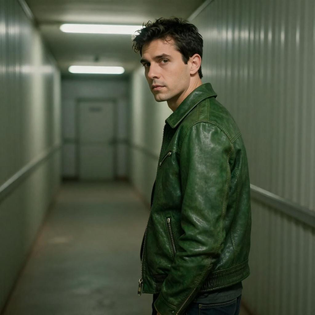 Photograph of a man with short dark hair, wearing a green leather jacket, standing in a dimly lit, green-tinted, industrial corridor with corrugated metal walls. He looks over his shoulder with a serious expression. Bright fluorescent lights illuminate the narrow hallway.
