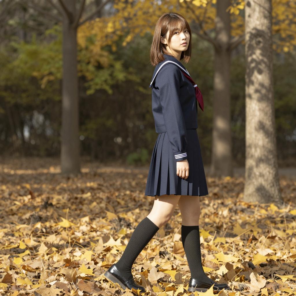 Asian woman with long brown hair and bangs, smiling, wearing a cream cardigan, black skirt, gray knee socks with red and black stripes, brown loafers, standing on one leg in a grassy yard. Green ivy-covered wall and window in background. Casual outdoor setting.