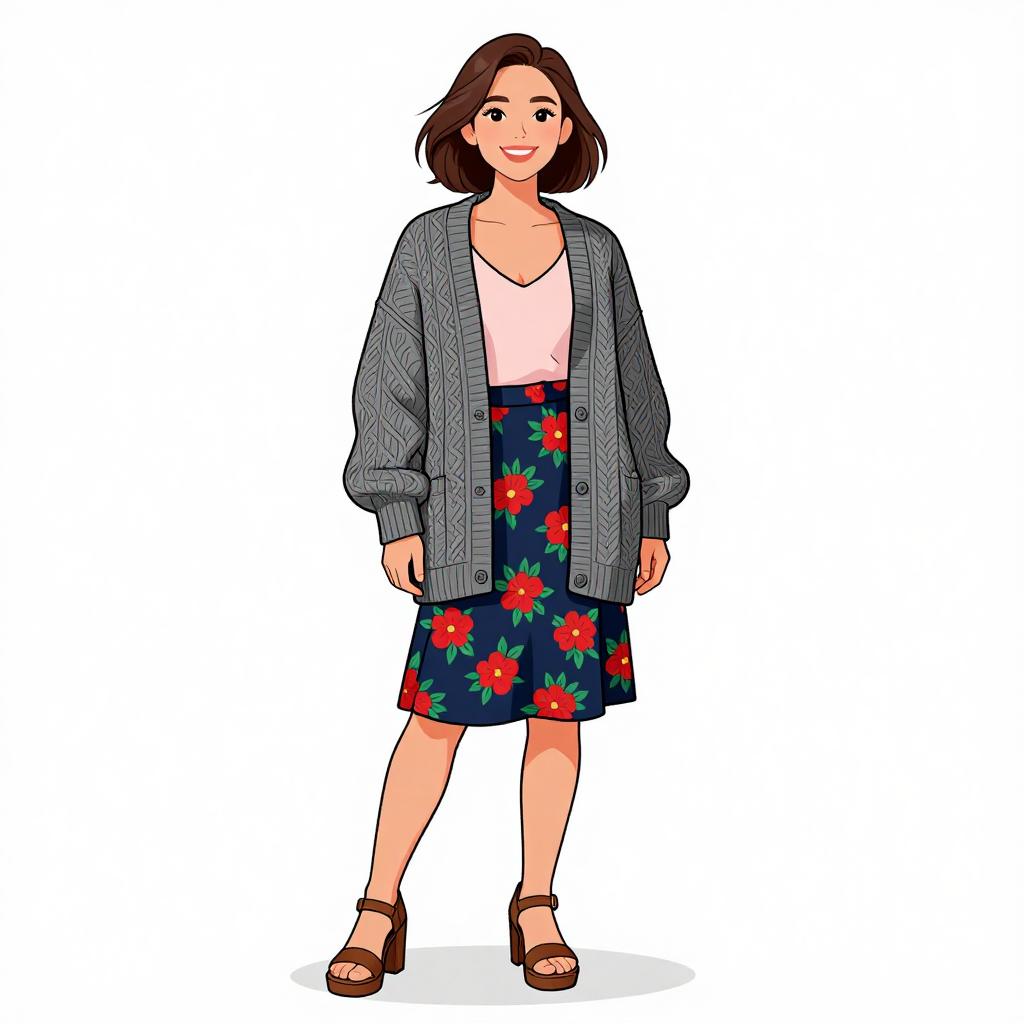 Woman with pretty face and pretty hair. smiling Woman, casual-chic, oversized cable knit cardigan in charcoal grey, open front, ribbed trim, drop shoulder, long sleeves, light pink V-neck tank top, floral A-line skirt in navy with red and green print, just above knee-length, brown leather platform sandals with ankle straps, white background with subtle shadow, studio lighting. --sref 1467