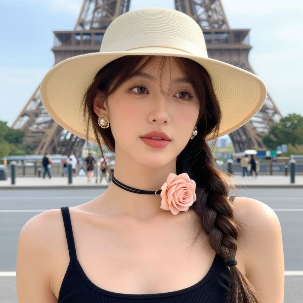 "parisian outfit female, 1girl, solo, hat, realistic, earrings, jewelry, flower, choker, hat flower, braid, rose Realistic photo of casual sexy person with pretty face"