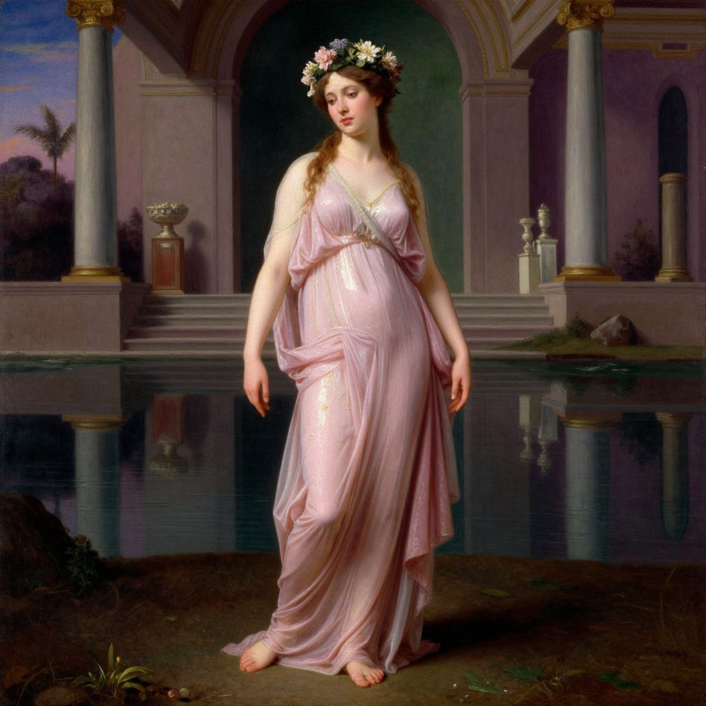 Photograph of a classical-style painting depicting a fair-skinned woman with long, brown hair, wearing a flowing, pale pink, Grecian-style dress with a gold waist sash. She stands barefoot on a reflective pool, in front of a grand, arching, marble structure with tall columns. She wears a floral crown of white and purple flowers. The background includes a dark, twilight sky and a distant palm tree. Her expression is serene, and the scene evokes classical Greek or Roman aesthetics, with a soft, romantic lighting highlighting her figure and the intricate architecture.