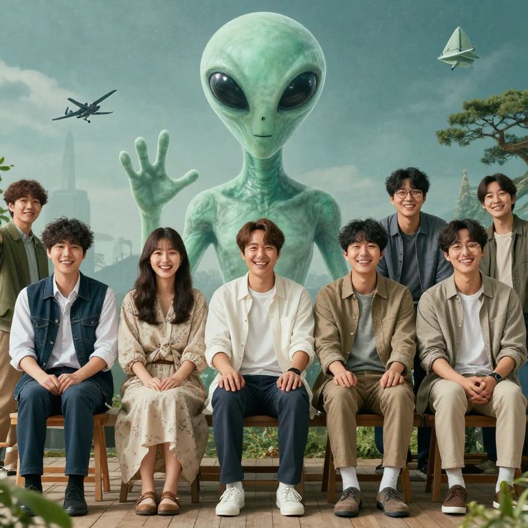 Linen seven sitting people, sci-fi novel writers, korean, smiling with good lurking alien, documentary poster style, realistic, upbeat mood, 4k,
