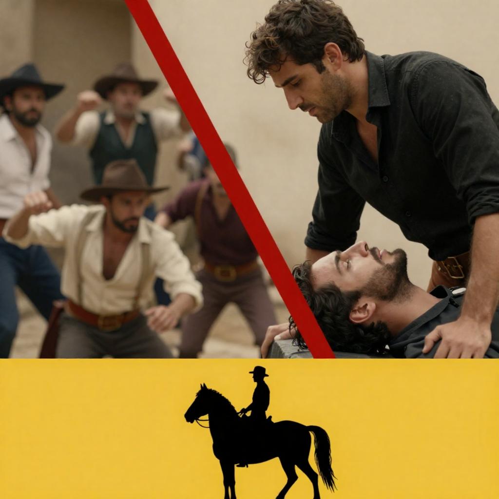 Movie poster for "Il Giuramento del Toro" featuring a dramatic split image: left side shows a chaotic, action-packed scene with multiple characters in traditional Spanish attire, while the right side depicts a close-up of a man in a black shirt leaning over another person. A bold red diagonal line separates the two scenes. The bottom has yellow and a black silhouette of a rider on a horse.