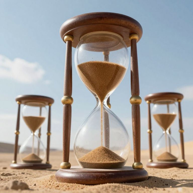 Enormous hourglasses stand defiantly against the sky, defying gravity as sand pours upward in a surreal dance, transforming the landscape into a realm where time flows backward and reality loops endlessly.