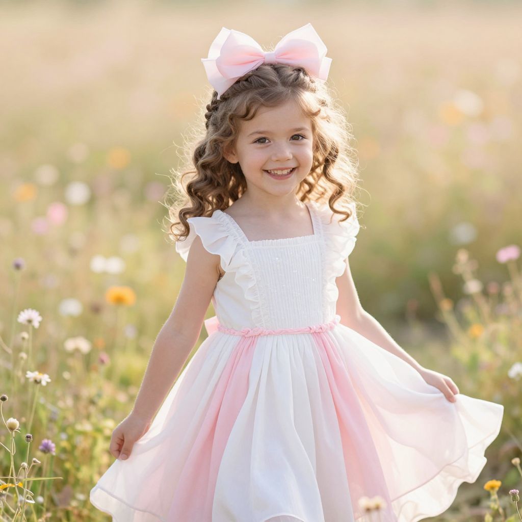 A cute girl with soft, curly hair styled in intricate braid patterns, wearing a vibrant white and pink dress with a large, delicate bow on her head. The dress features a flowing silhouette adorned with subtle ruffles and gentle folds, giving it a dreamy, feminine elegance. She stands in a sunny meadow filled with blooming wildflowers and golden dappled sunlight, creating a bright and cheerful atmosphere. Her warm, playful smile shines with joy, enhancing the whimsical and serene mood of the scene. The background includes soft pastel hues and gently swaying grass, adding depth and a sense of peaceful adventure, capturing a moment of pure innocence and delight.