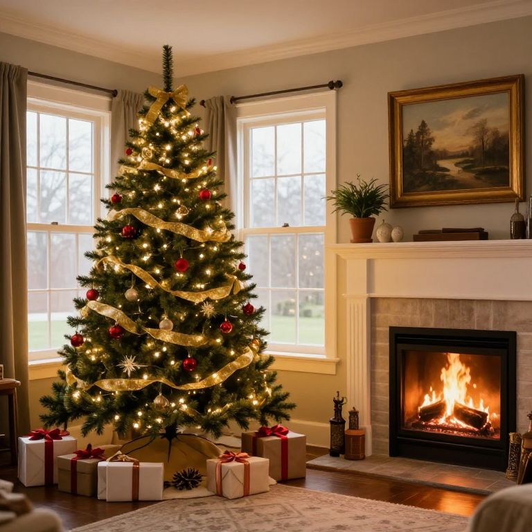 Cozy living room warmly illuminated by a beautifully decorated Christmas tree adorned with gold ribbons, red ornaments, and twinkling lights, positioned between two windows and surrounded by festive gifts, a fireplace with a crackling fire, and a framed painting above a mantel featuring potted plants and decorative items.