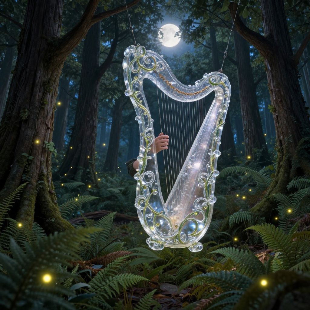 Photograph of a glowing, crystal harp with illuminated strings, hanging in a dark, enchanted forest, with glowing fireflies and a moonlit sky