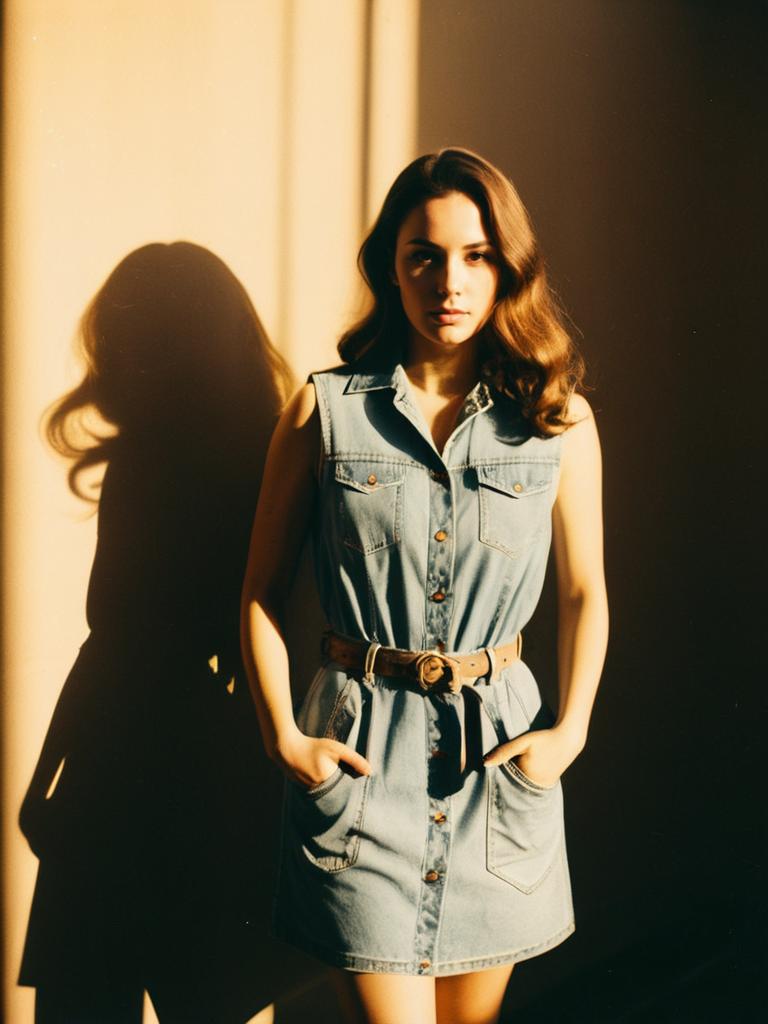 Portrait of a woman wearing a casual chic sleeveless denim mini dress with a pointed collar, front button fastening, two chest pockets with flaps, and a nipped waist with belt loops. She stands against a plain background with warm light casting her shadow on the wall.