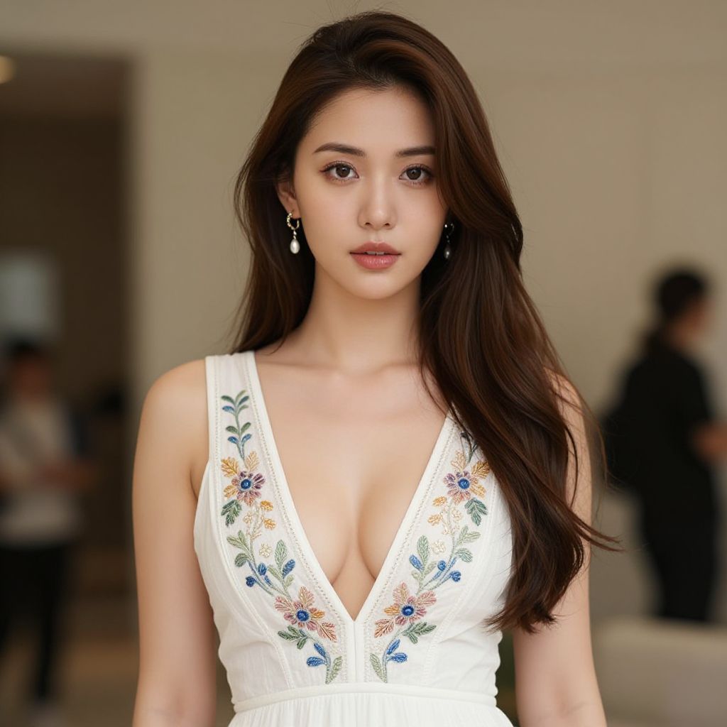 "embroidered evening dress, 1girl, solo, dress, breasts, long hair, brown hair, white dress, cleavage, looking at viewer, brown eyes, jewelry, blurry background, earrings, blurry, medium breasts, indoors Realistic photo of casual sexy person with pretty face"