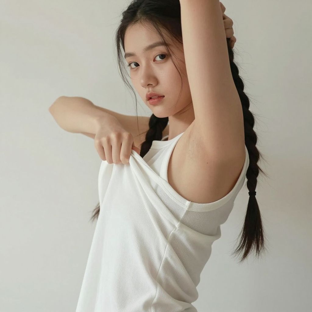 Masterpiece, best quality, 1girl, handpull, pulled by self, clothes pull, shirt pull, one breast out, no bra, armpits, arm up, from side, upper body, sidelocks, sleeveless, shirt, sideboob, looking at viewer