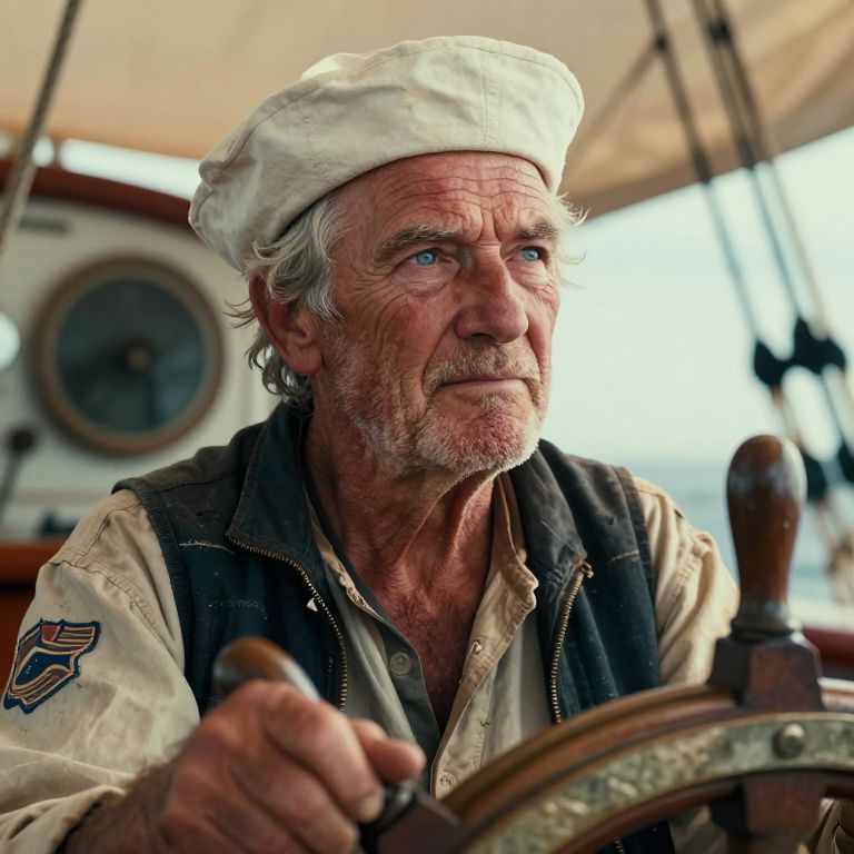 Create a hyperrealistic portrait of an aged sailor, his sun-kissed skin and dreamy blue eyes gazing off into the distance. This unique 'bug's-eye view' perspective captures the essence of a life spent at sea, showcasing intricate details such as the worn patches on his clothes and the calloused hands that grip the ship's wheel. The lighting is soft and warm, casting a gentle glow on his rugged face and evoking a striking blend of strength and vulnerability.