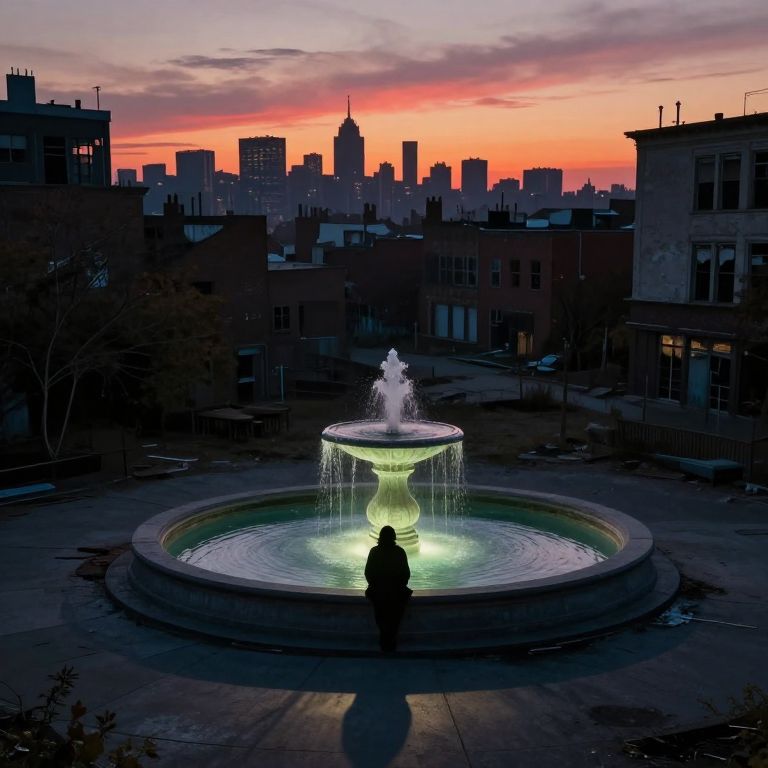 A haunting portrait in the style reminiscent of Edward Hopper's iconic work, depicting a solitary figure bathed in the soft glow of neon lights, seated at an enigmatic fountain in an abandoned urban oasis. Captured from a high vantage point, this eerie scene emphasizes the tranquil solitude and introspective mood. As dawn breaks over the sprawling metropolis, the warm hues of the setting sun cast elongated shadows across the desolate landscape, evoking a sense of isolation and hope amidst decay. The stark contrast between the vibrant colors of the fading cityscape and the subdued tones of the forgotten fountain creates an atmospheric composition that encapsulates the beauty and melancholy of a world in transition.