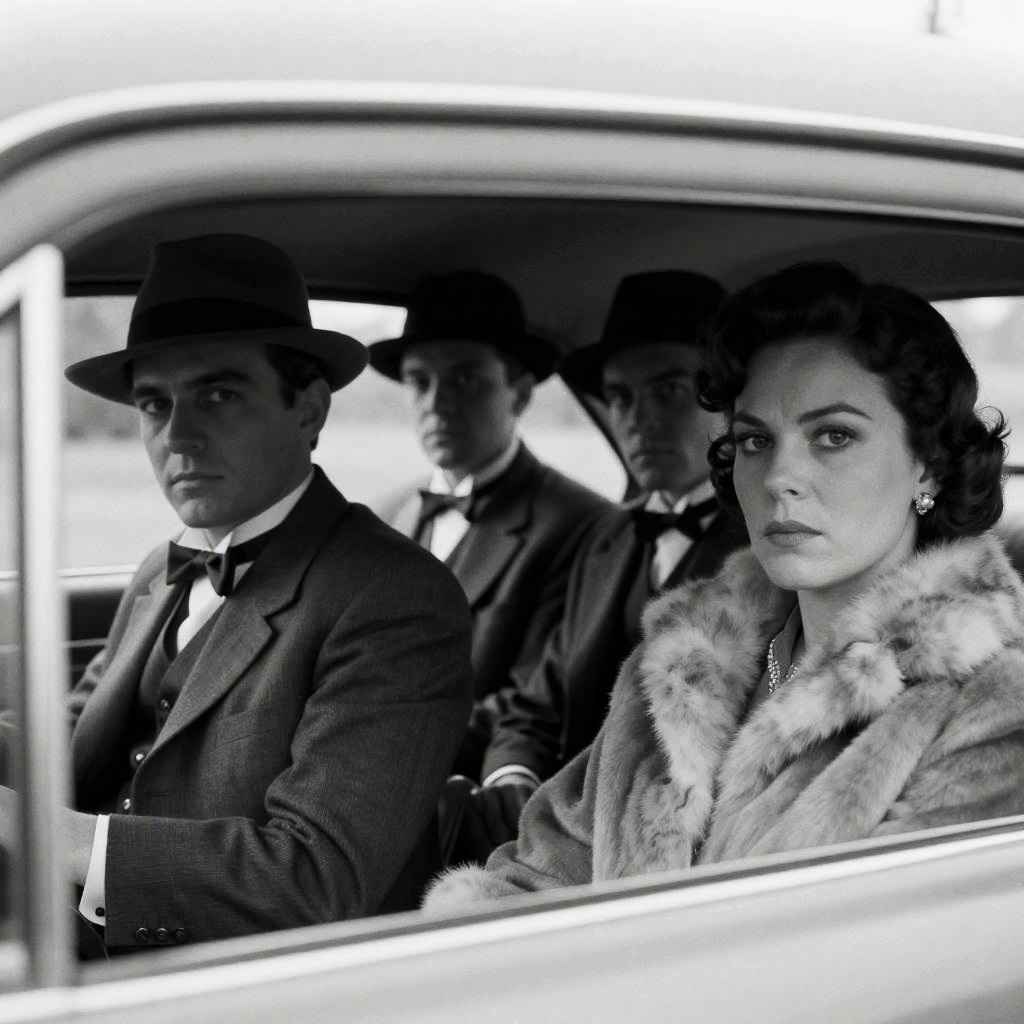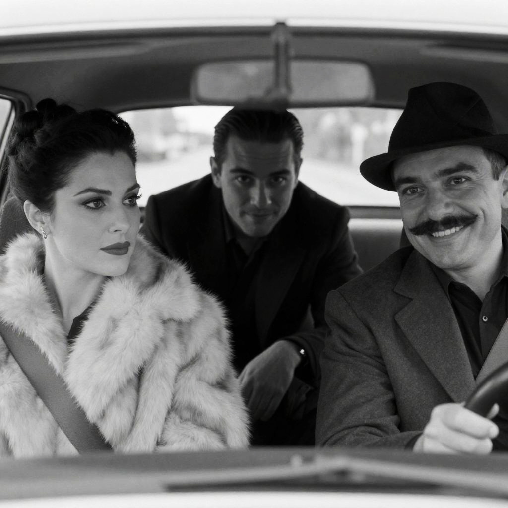 Black-and-white photograph of a man in a checked suit sitting in a car, smiling at four people in the car window. Four people, two women with hats and one man with a mustache, laughing and smiling back. Man wears tie and dark suit. Background blurred, window visible. All expressions are joyful and friendly.