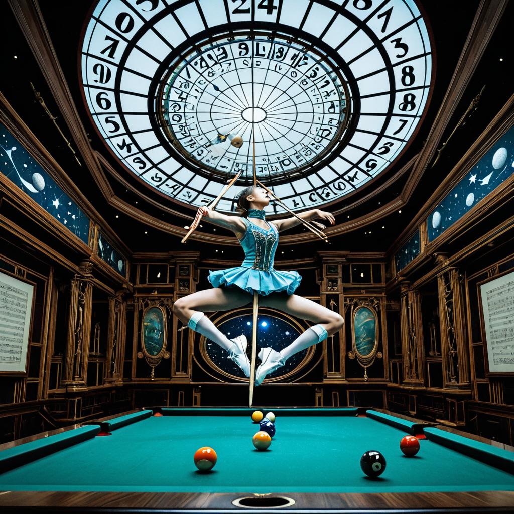 A surreal image of a female dancer in a blue costume performing a dynamic pose above a billiards table. The ornate room features celestial and astronomical motifs with a large circular skylight displaying mysterious numbers and symbols. The scene combines elements of fantasy, mathematics, and cosmic themes, blending dance, geometry, and billiards in a futuristic, artistic setting.