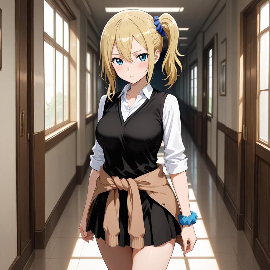 This vibrant digital illustration features a confident woman with short blonde hair and piercing blue eyes, dressed in a stylish white lab coat over a fitted purple outfit. Rendered in a polished anime style, the character exudes professionalism and poise, set against a softly blurred office background.