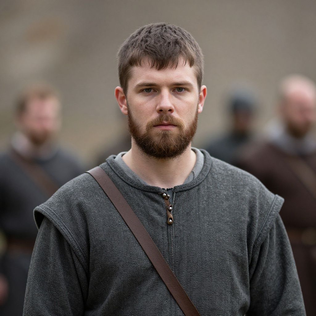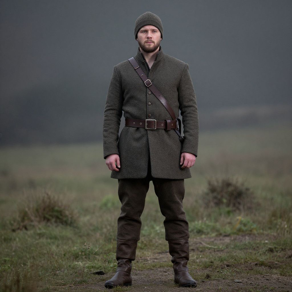 Outlander costume, 1boy, male focus, solo, beard, facial hair, standing, hat, boots, full body, belt, looking at viewer, arms at sides, brown footwear, pants, long sleeves