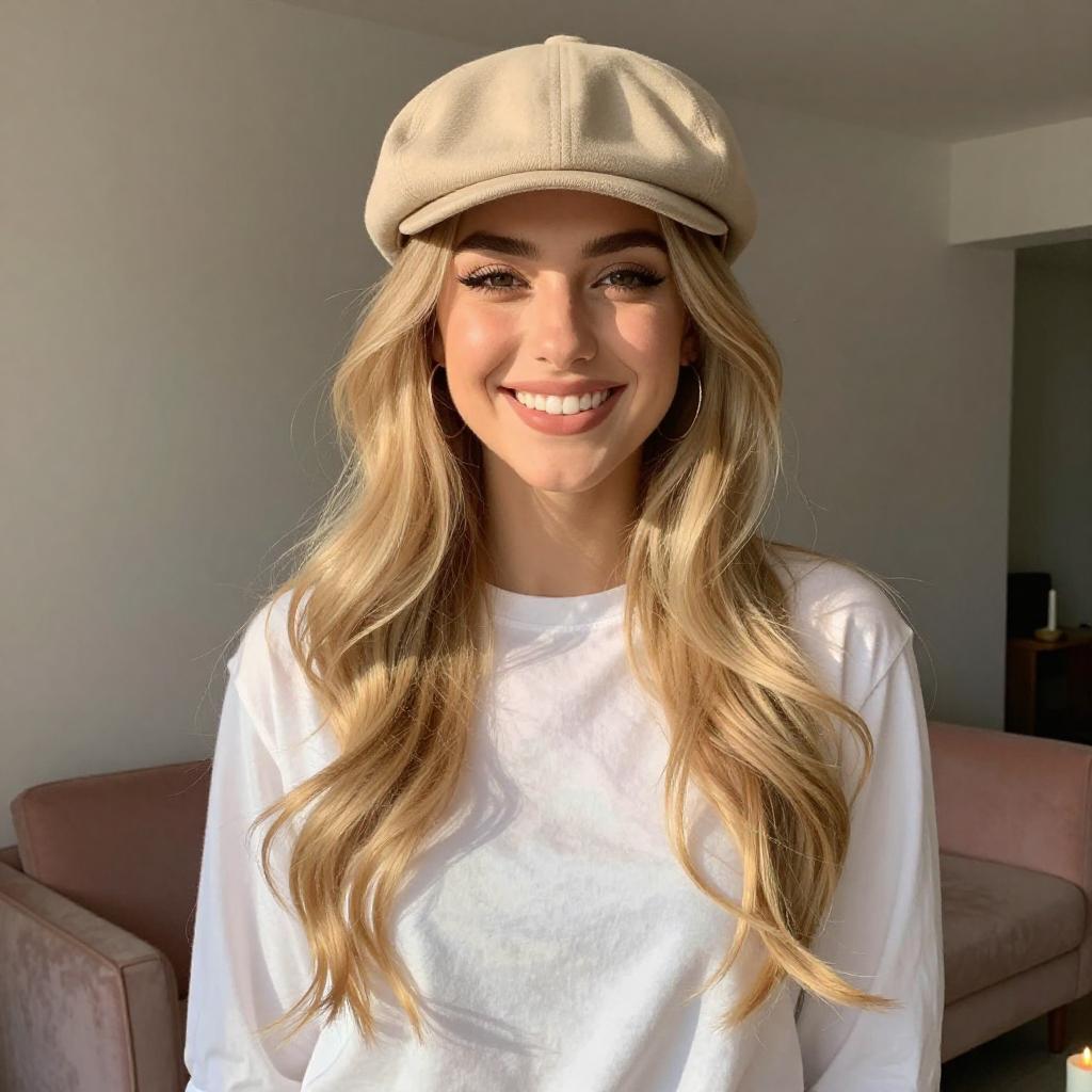 Photograph of a young woman with wavy blonde hair, wearing a white off-shoulder ruffled blouse and blue jeans, sitting on a beige couch. She has a black bow in her hair and red lipstick. Behind her are two decorative tiles: a circular floral design and a square geometric pattern. A white lampshade is on a table to the right.