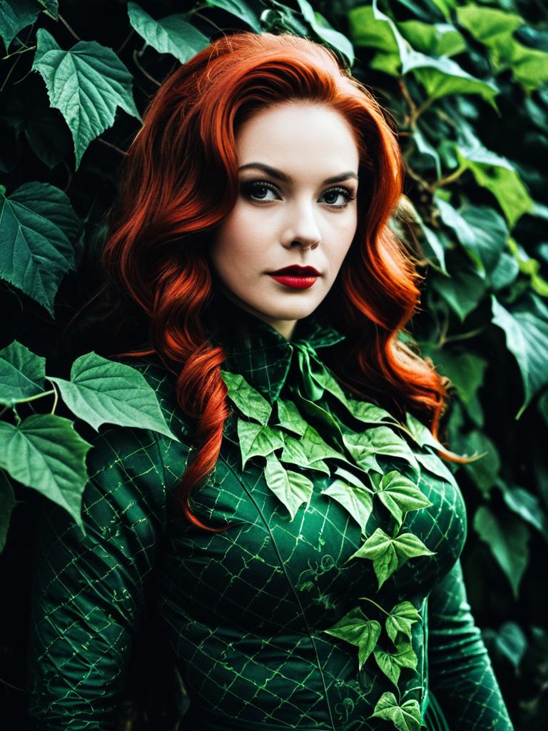 Woman in Vintage Poison Ivy Costume, cinematic realism, retro villain portrait