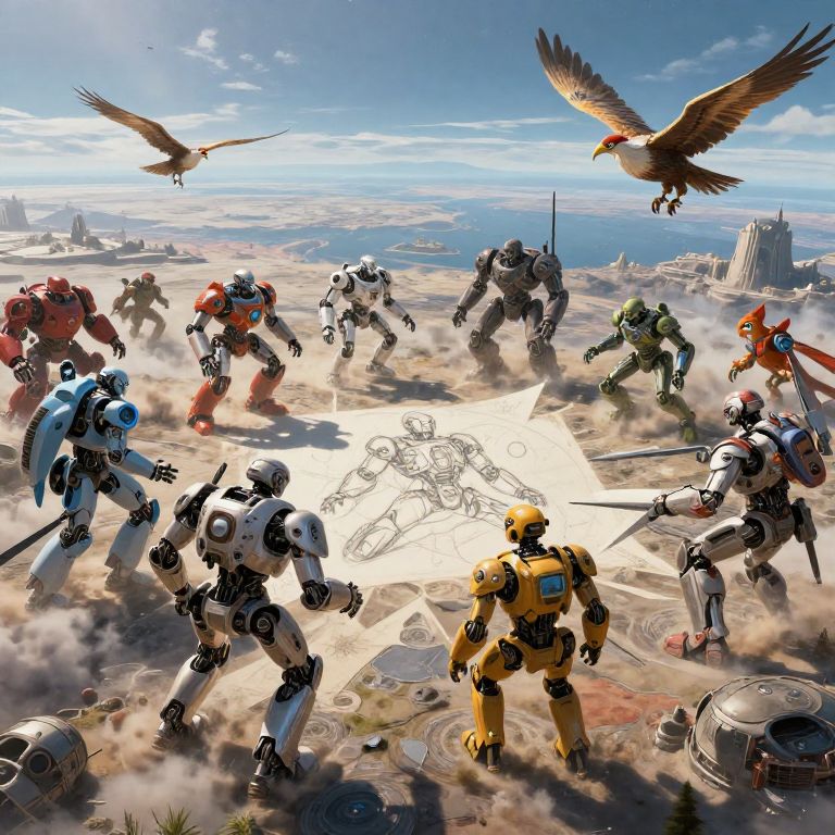 "Figure Drawing an epic sci fi battle between robots and humanoid bird people on an idillic planet, epic, cinimatic, areal view,"