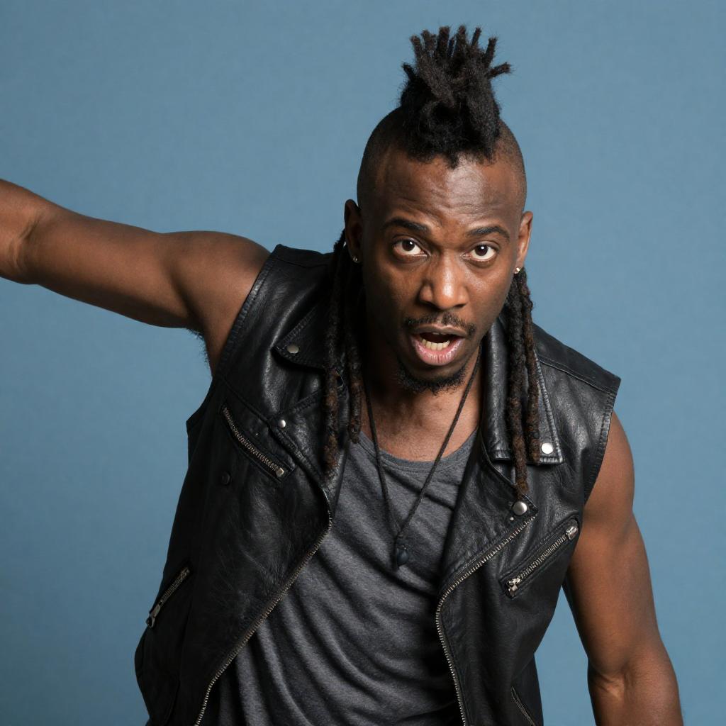 Photograph of a black man with a mohawk hairstyle and dreadlocks, wearing a black leather vest over a gray shirt, with a necklace. He has intense, slightly open-mouthed expression, leaning forward with outstretched right arm. Blue background. One person.