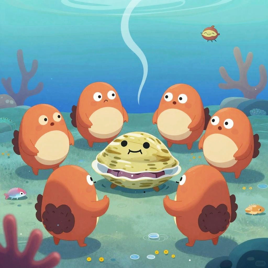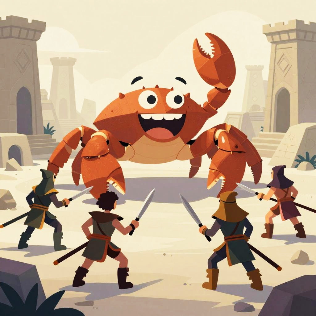 This digital cartoon illustration depicts a desert scene with four armored knights and a brown-clad warrior facing a large, green, snake-like creature with a white underbelly. The knights, wielding swords, stand in a semi-circle, while the warrior stands slightly forward. The background features underwater-like elements with pink and purple coral, blue fish, and a blue sky with light rays. The snake, with large, expressive eyes, dominates the center. The style is vibrant and playful, with bold colors and simple shapes, reminiscent of video game art.