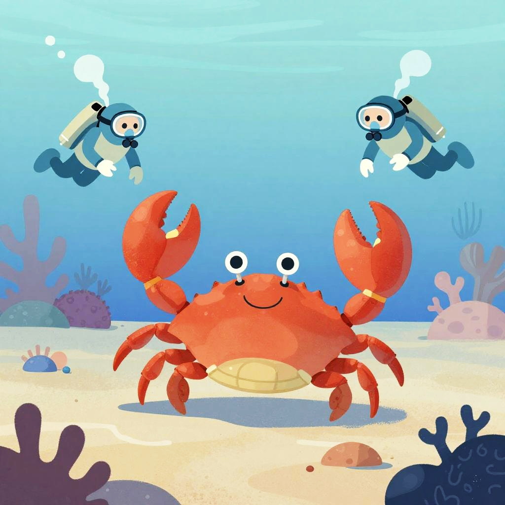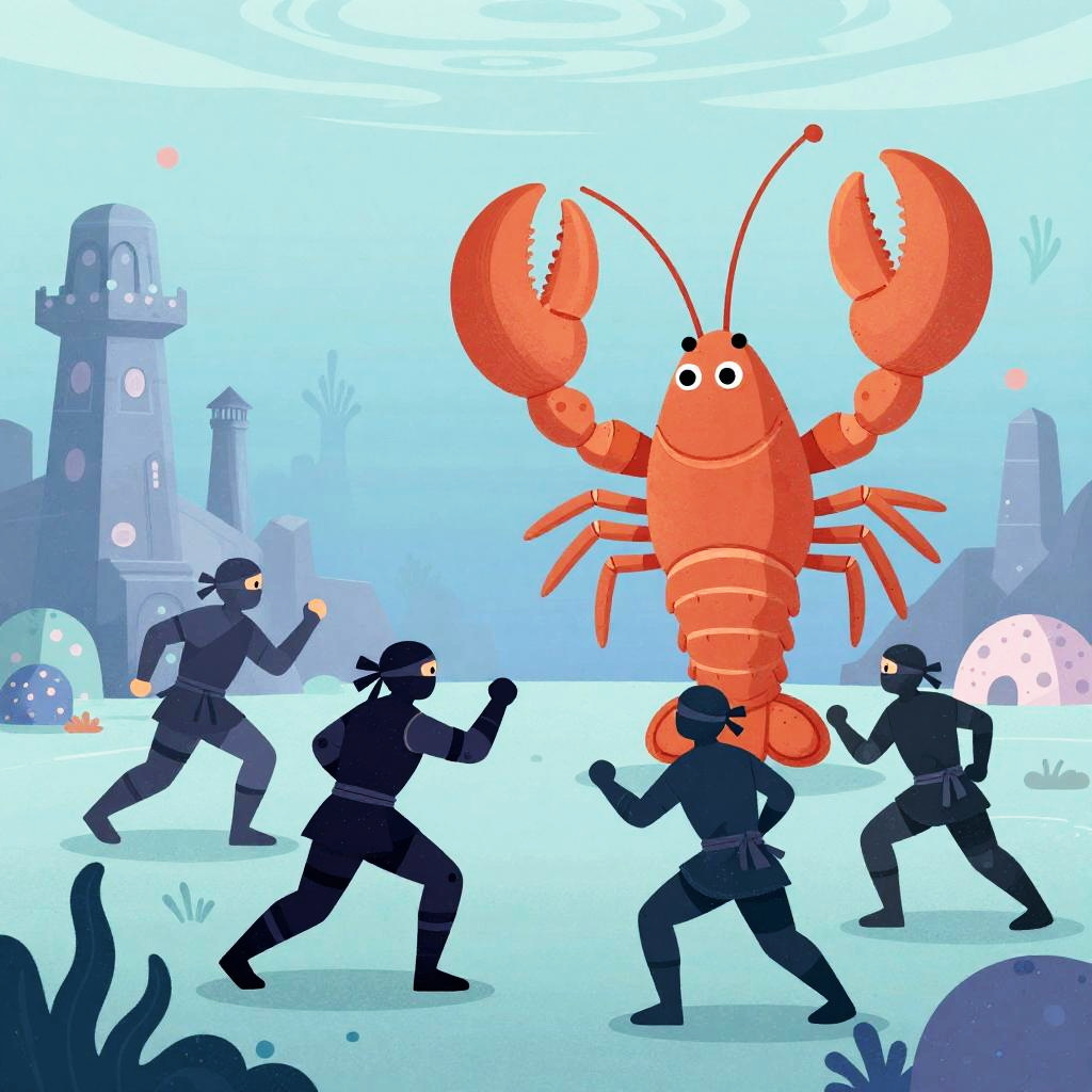 Digital cartoon of four armored knights and a brown-clad warrior facing a large, green snake in an underwater fantasy setting.