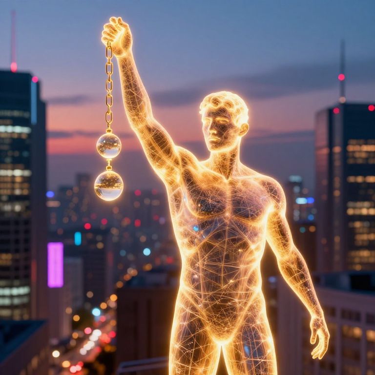 Adherence depicted as a glowing figure holding a chain of connected glowing orbs symbolizing commitment and continuous effort, set in a futuristic cityscape at dusk with neon lights reflecting determination and discipline, intricate details, vibrant colors.