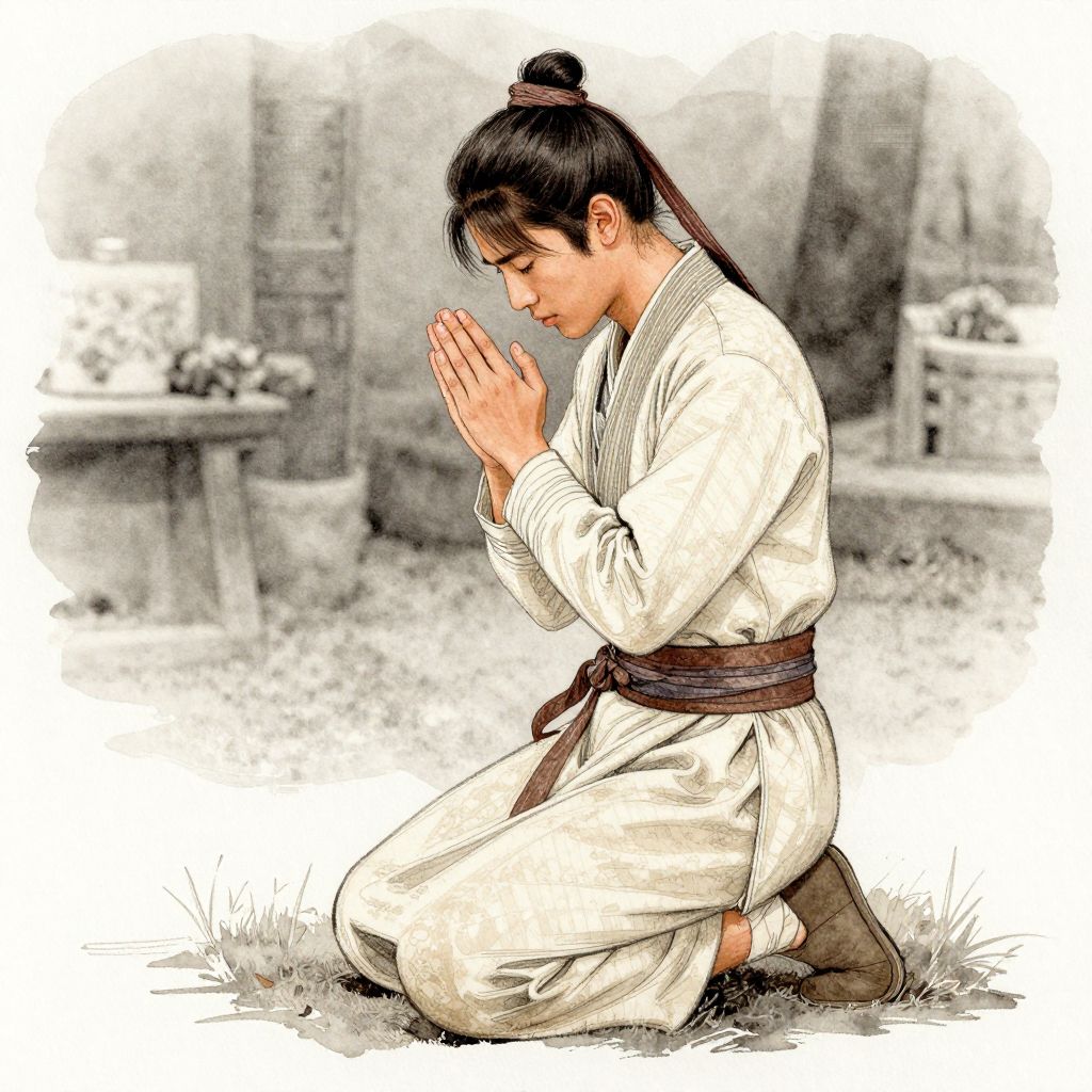 A young man in an ancient dress kneels on the ground, praying, with a dark ink pen outline and a grayscale watercolor background resembling vintage photographs, created by Elicia Edijanto.