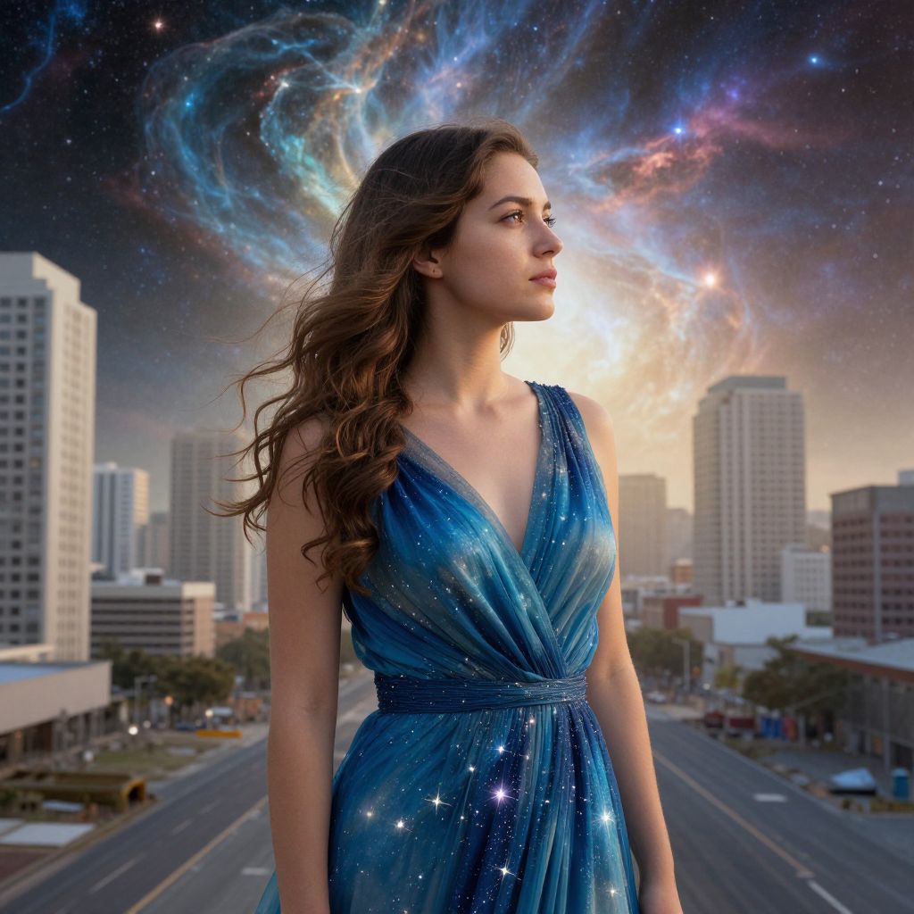 Photograph-like digital artwork of a young woman with long, wavy brown hair, wearing a sparkling blue, V-neck gown with a wrap-style bodice. She stands on a city street with tall buildings in the background, gazing into the distance. The sky behind her is a vibrant, cosmic scene with swirling, colorful nebulae and star formations, blending with the cityscape. The sun is partially visible, casting a soft light over the scene. The street below is empty, with clear lanes and a few distant cars. The woman's expression is serene and contemplative.