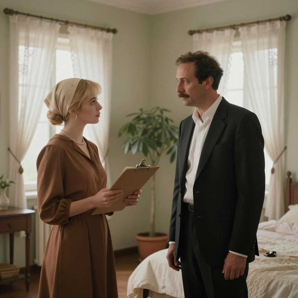 Two men in gray suits with white shirts and black ties stand indoors, holding a blue map with white lines. The man on the left has a mustache, while the man on the right is clean-shaven. Both men look at the map intently. The background includes dark wooden furniture and an arched mirror. The man on the right holds the top of the map, while the man on the left holds the bottom. The setting is dimly lit.