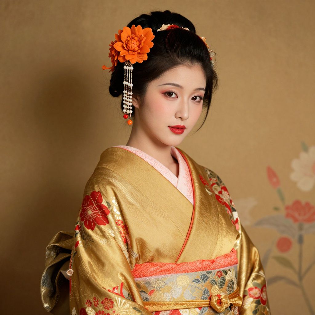 A digital illustration portrays a woman adorned in a luxurious gold kimono with intricate red floral patterns, complemented by a vibrant orange flower hair accessory featuring dangling beads, set against a warm, textured background with subtle floral motifs, evoking a high-definition, vintage-inspired aesthetic.