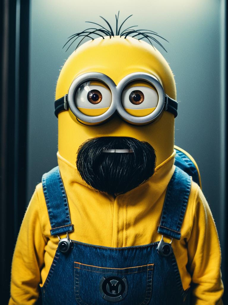 Man in Minion costume, cinematic realism, sharp portrait