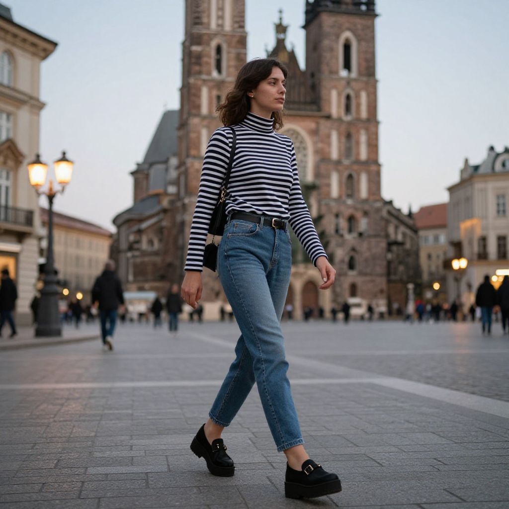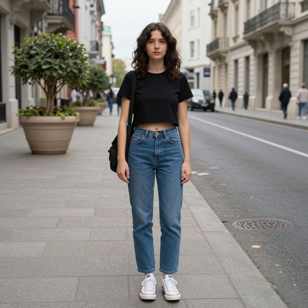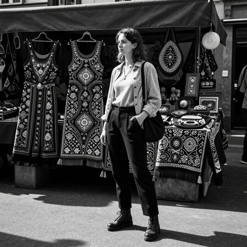 Monochrome street outfits, European woman, seated on a stone bench in a quiet plaza, realistic photography, soft natural light, monochrome with accents of blue, urban setting, high quality detail