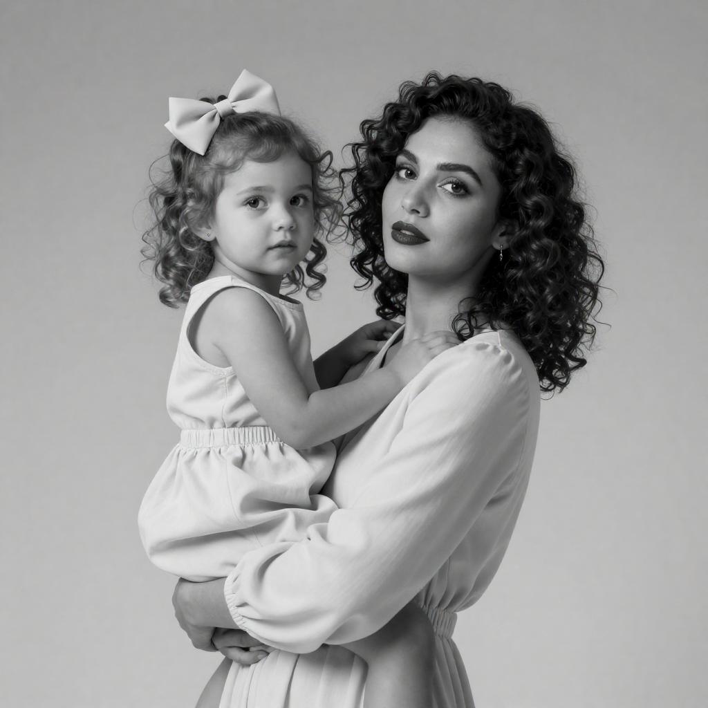 Black and white photograph of a woman with curly hair and dark lipstick, holding a young girl with curly hair and a large bow. Woman wears a light-colored, long-sleeved dress, girl wears a similar dress. Woman looks to the side, girl looks at camera. Woman's right arm around girl's waist, left hand under girl's back. Soft gradient background.