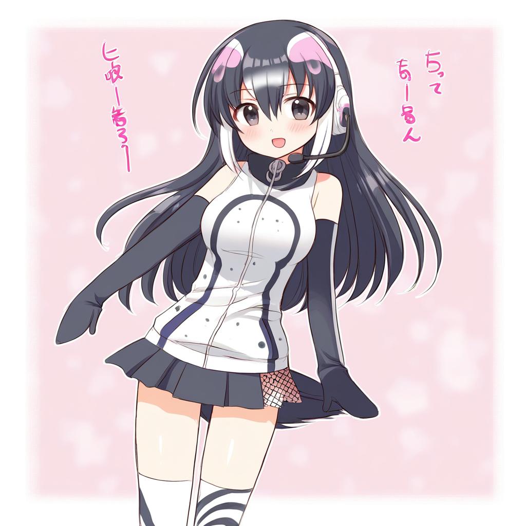 African penguin (kemono friends), kemono friends, 1girl, tail, black eyes, black hair, long hair, multicolored hair, white hair, pink hair, skirt, headphones, virtual youtuber, virtual youtuber, penguin girl, microphone, by artist kishida shiki, animagine
