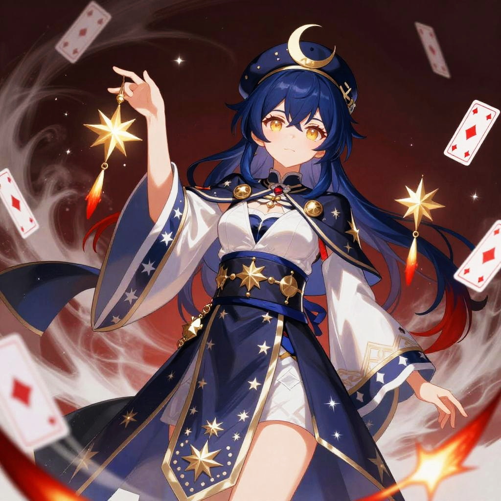 Anime style female character with midnight blue hair and amber-gold eyes, wearing a celestial shrine priestess robe with star-patterned brocade, layered sashes, and a crescent moon beret, holding suspended star-forged talismans and trailing comet-fragment charms, surrounded by floating playing cards. The scene features a dynamic swirling smoky background with bright red and white highlights, intricate costume details, sharp expressive eyes, and an energetic and magical atmosphere. Rendered in high contrast and vibrant colors as detailed digital art.