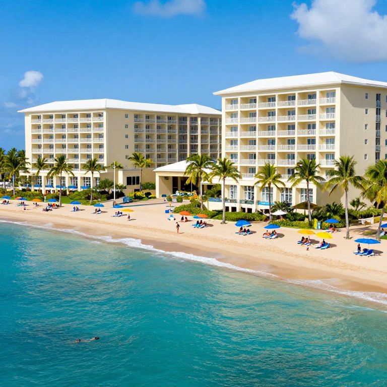 Caribe Hilton Resort in Puerto Rico showcases a stunning beachfront property with two large, cream-colored buildings featuring numerous balconies, surrounded by lush palm trees and vibrant blue waters where guests enjoy sunbathing under colorful umbrellas and swimming in the turquoise sea.